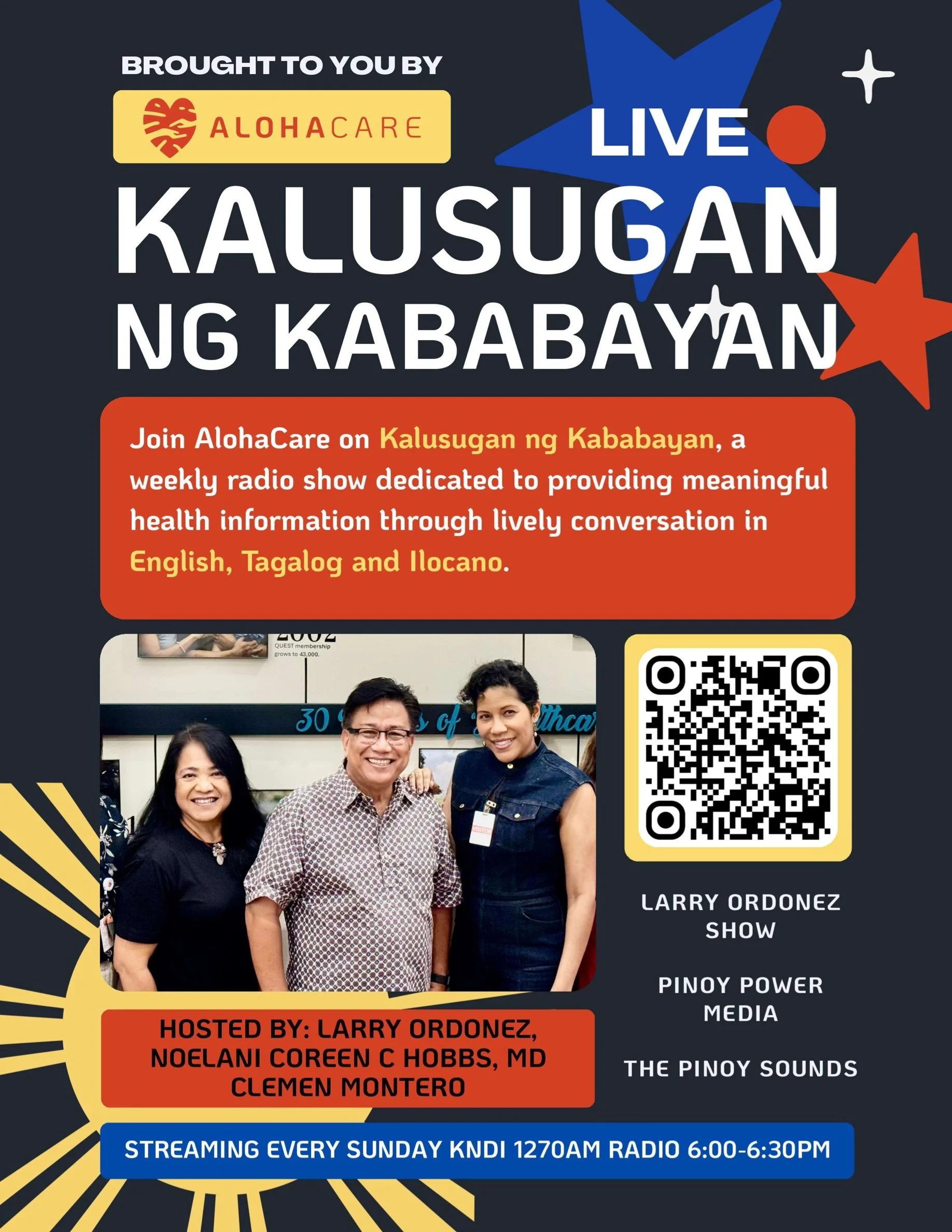 Tune in to “Kalusugan ng Kababayan,” a weekly AlohaCare radio show hosted by Larry Ordonez, Dr. Noelani Coreen C. Hobbs, and Clemen Montero, sharing health insights in English, Tagalog, and Ilocano every Sunday on KNDI 1270AM from 6:00–6:30 PM.